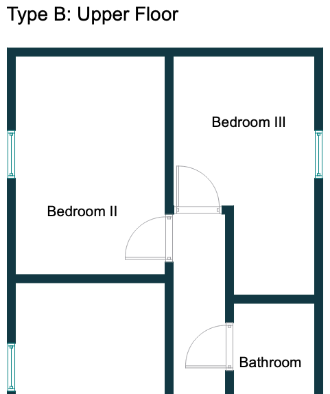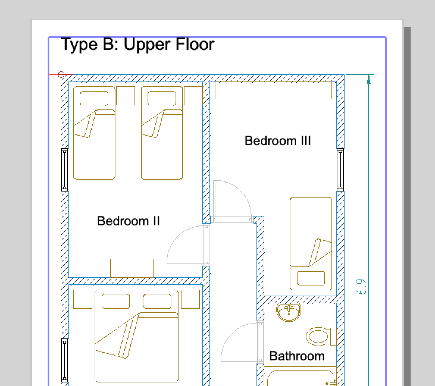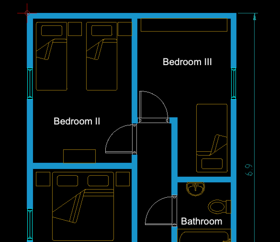 Este dibujo se creó pensando en el fondo oscuro de una vista de espacio típica de un modelo CAD. Las paredes tienen un relleno sólido para que sean bien visibles y las ventanas se muestran en un cian brillante.