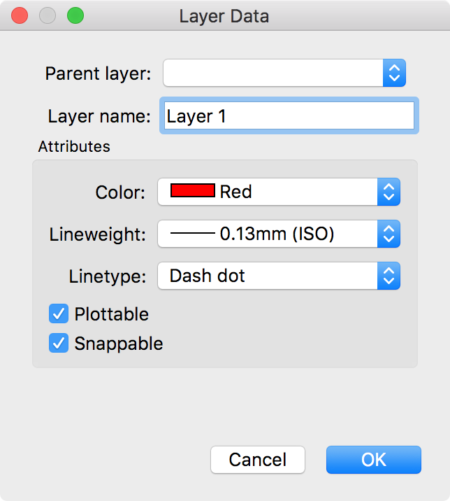 Utilice la herramienta Capa > Añadir capa para crear una nueva capa. Llame a la capa "Capa 1" y dele un color (rojo), grosor de la línea (0,13 mm) y tipo de línea (punto de guion):