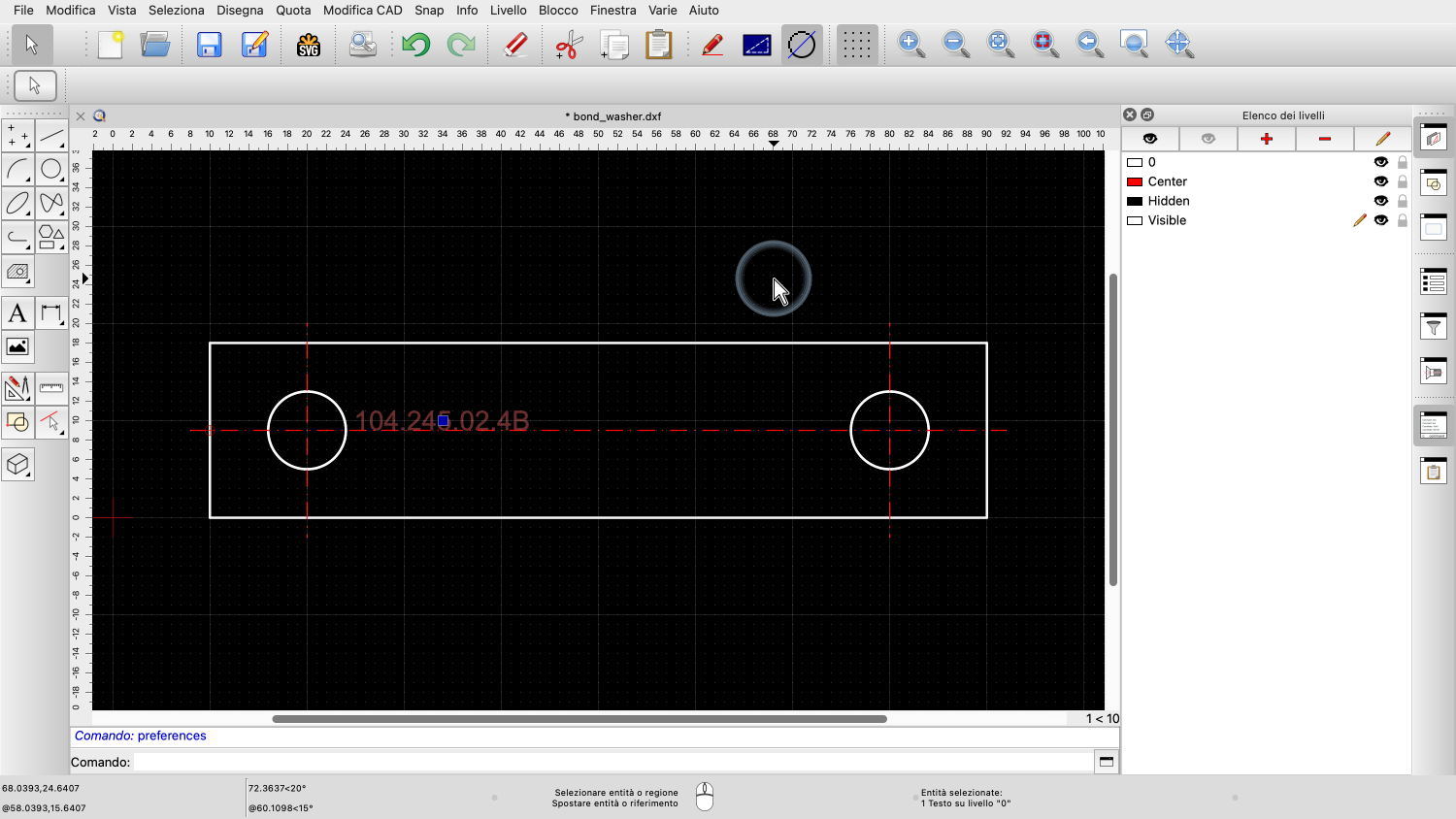 La linea centrale e i due cerchi sono ora negli appunti di QCAD.