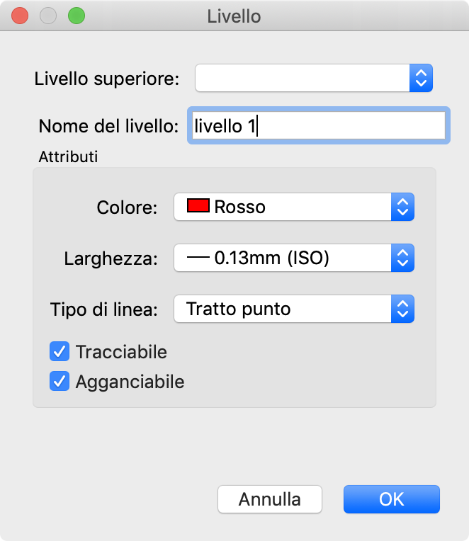 Utilizza uno Livello > Aggiungi livello strumento per creare un nuovo livello. Chiamalo “Livello 1” e attribuisci un colore (rosso), spessore di linea (0.13mm) e tipo di linea (punteggiato):
