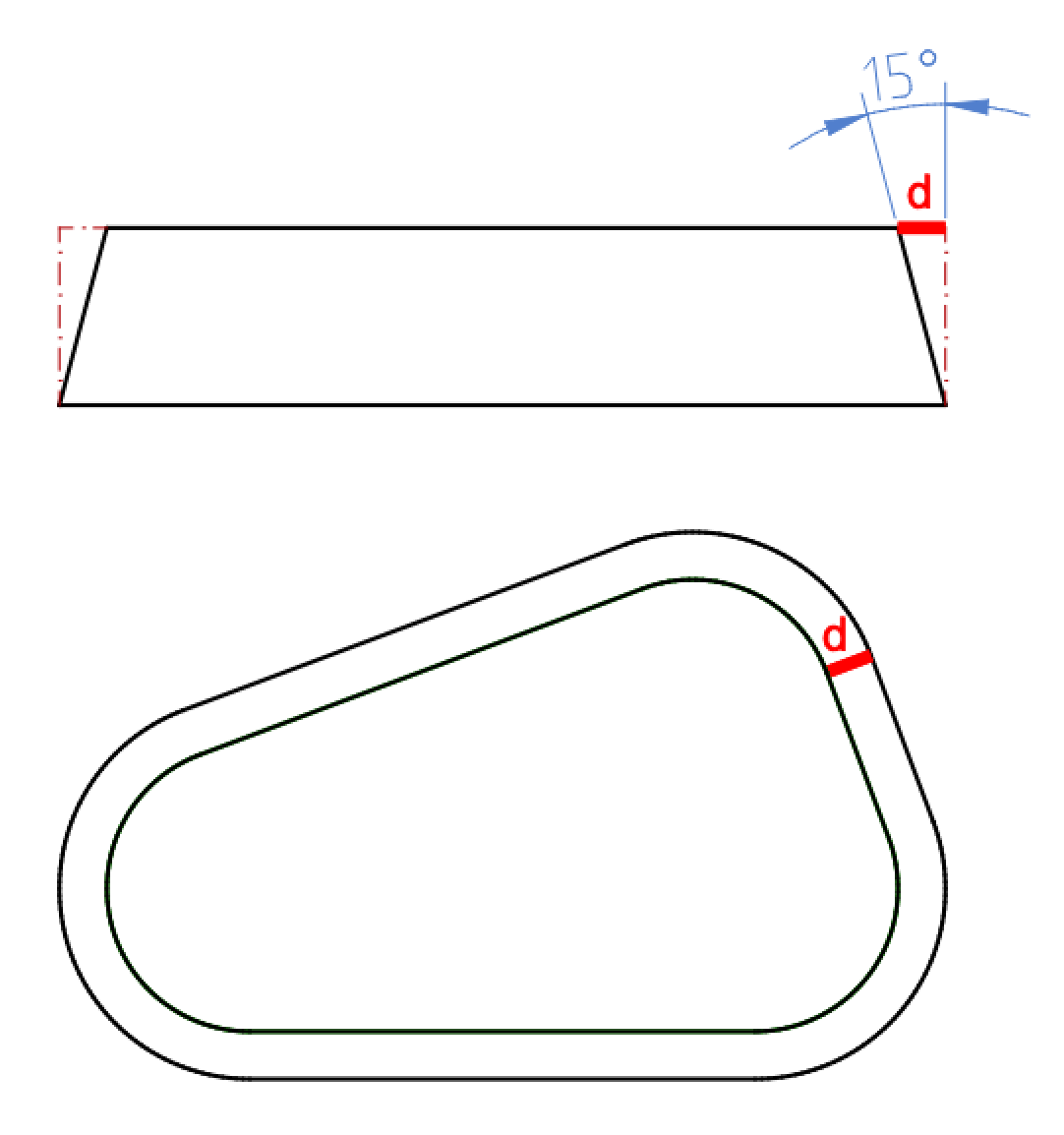 The distance for the offset tool is visible in the front view of the part shown at the top (length of the red line d):