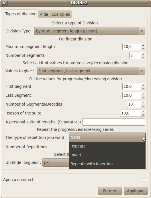Je voudrais pouvoir spécifier un nombre d'éléments à disposer sur un tracé et imposer une progression (arithmétique, géométrique, logarithmique) positive ou négative. Le système calculera lui-même les meilleures distances pour compléter la série.