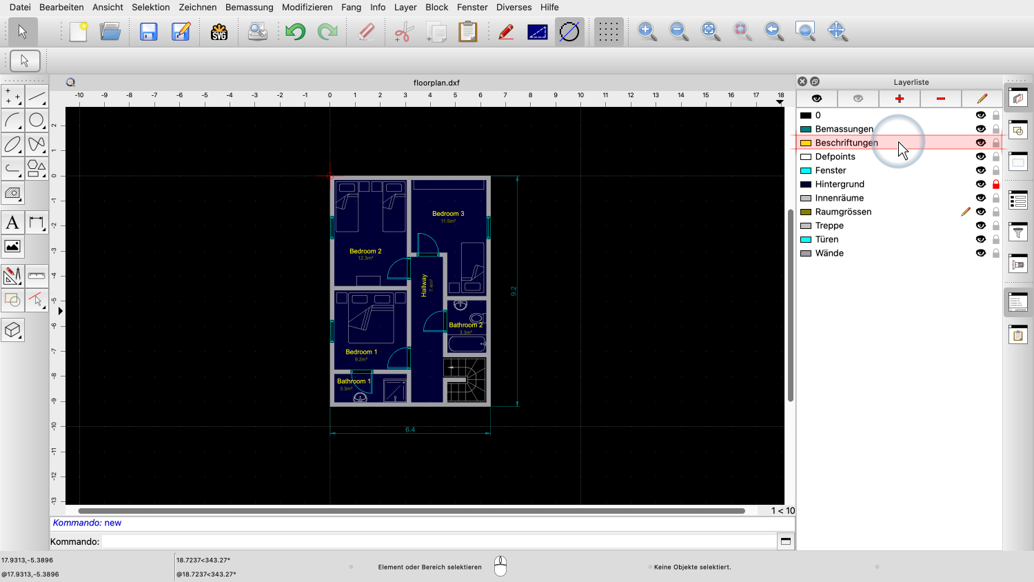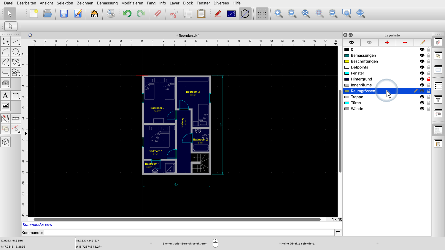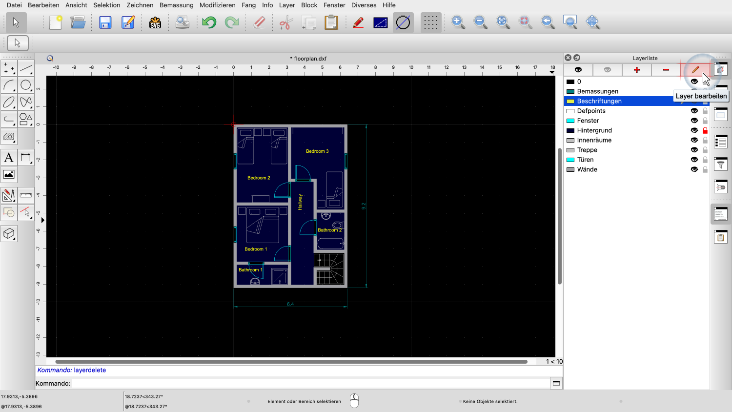 Um z.B. den Layer mit den Raumgrössen zu löschen, aktivieren wir zunächst den Layer, indem wir auf seinen Namen klicken.