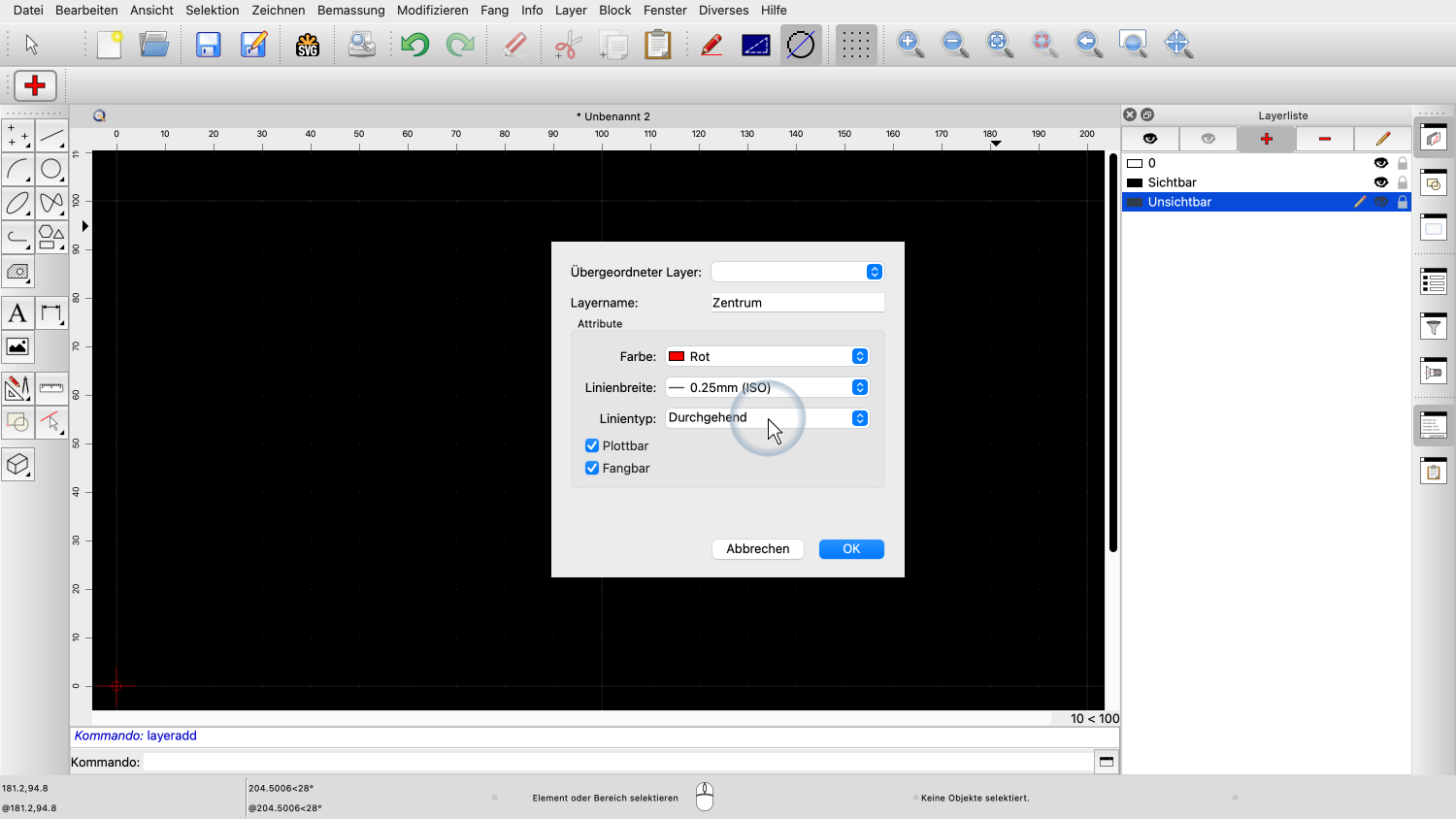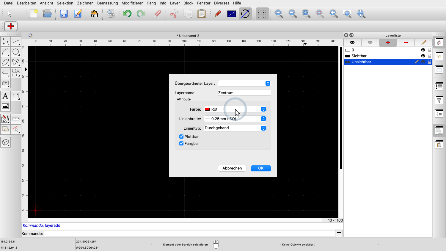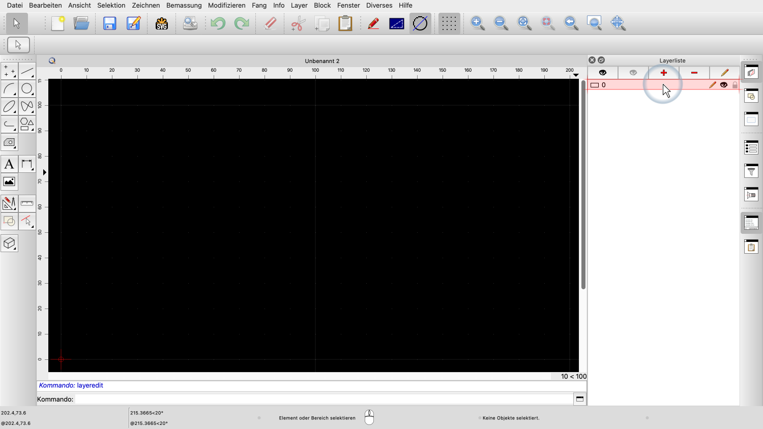 Wie allgemein empfohlen, lassen wir Layer 0 leer und erstellen unsere eigenen Layer für unsere Zeichnung.
