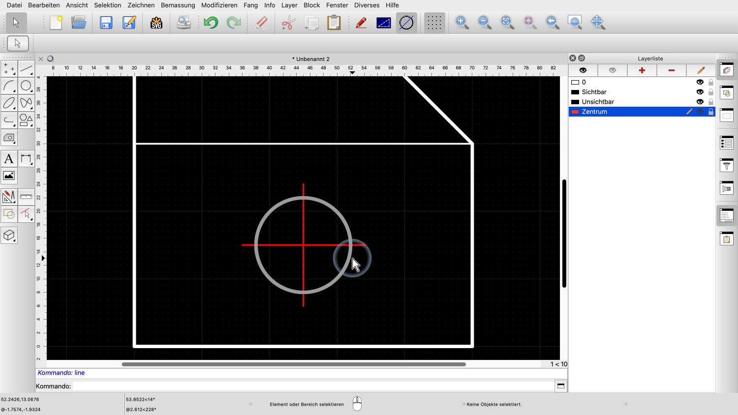 Schliesslich zeichnen wir die Mittellinien für den Kreis auf dem Layer Zentrum.