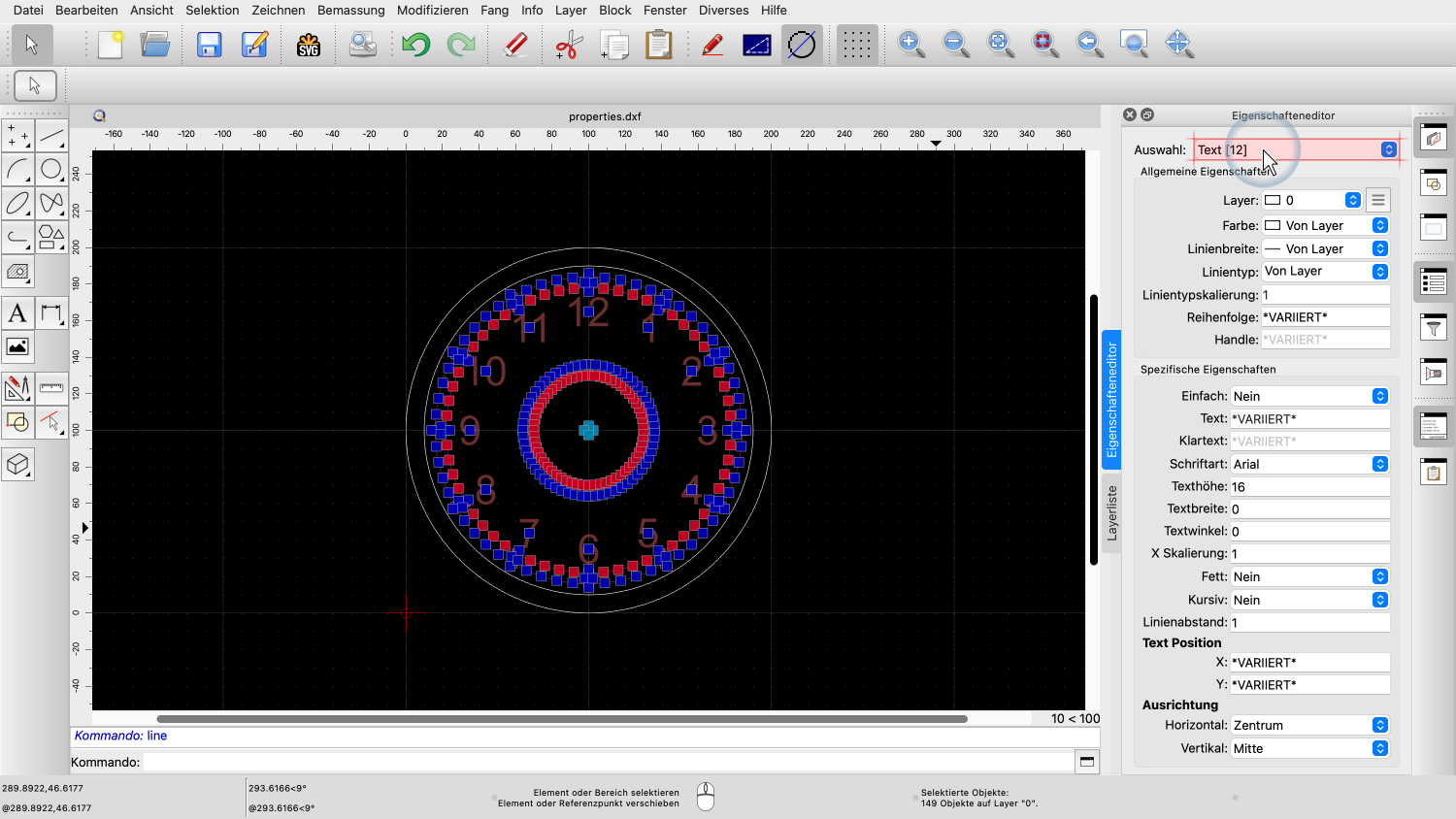 Die Zahl in eckigen Klammern gibt an, dass 12 Textobjekte ausgewählt sind und sich unsere Änderungen im Eigenschafteneditor nur auf diese 12 Objekte beziehen.