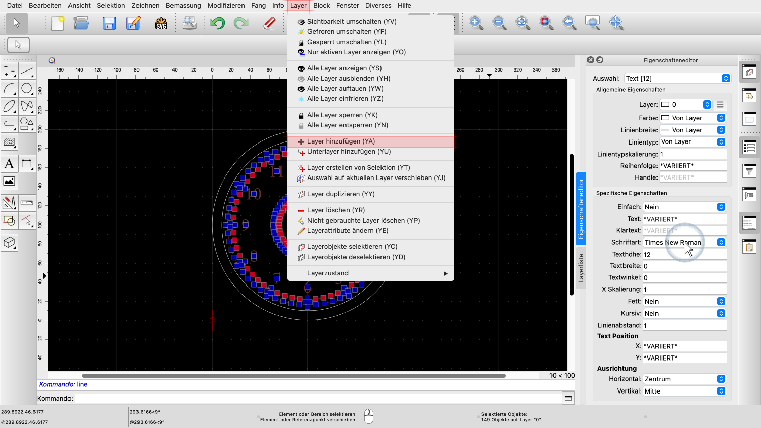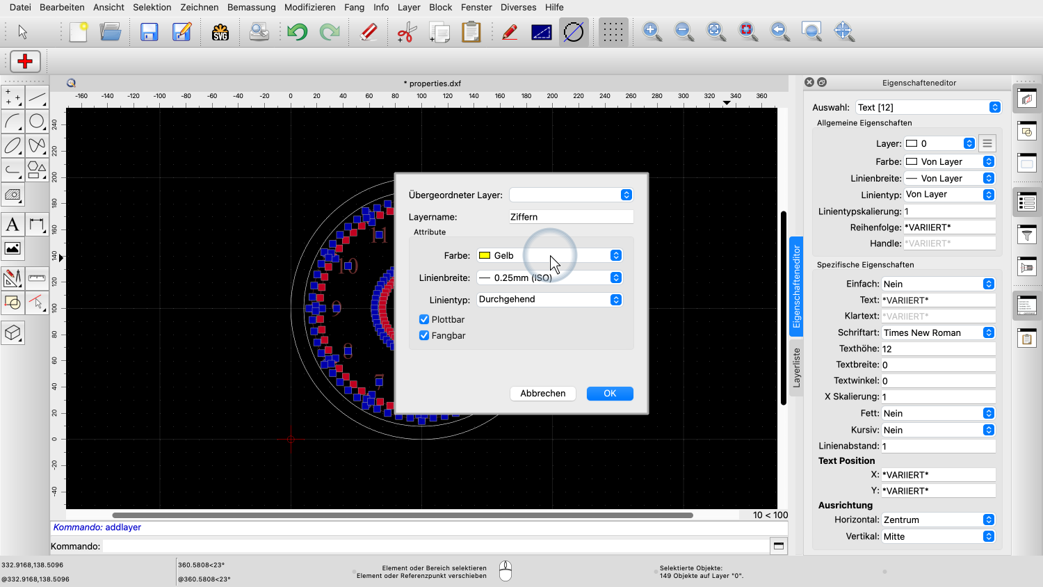 Zurück im Eigenschafteneditor können wir nun den Layer unserer Textobjekte auf den neu hinzugefügten Layer ändern.