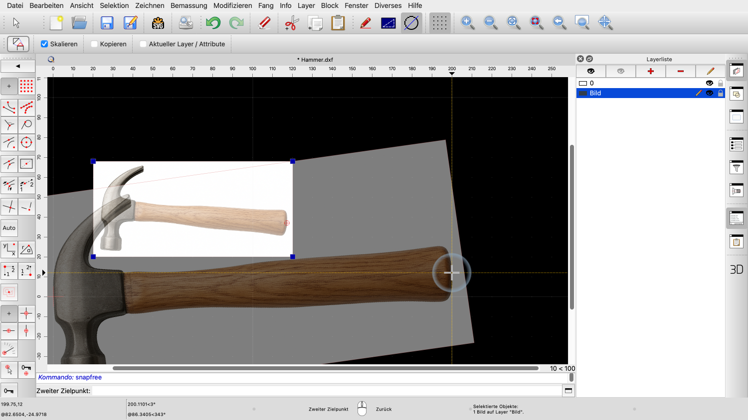 In den folgenden Schritten werden wir das Bild so skalieren und drehen, dass der Hammerstiel horizontal liegt und der Hammer die gewünschte Grösse hat.