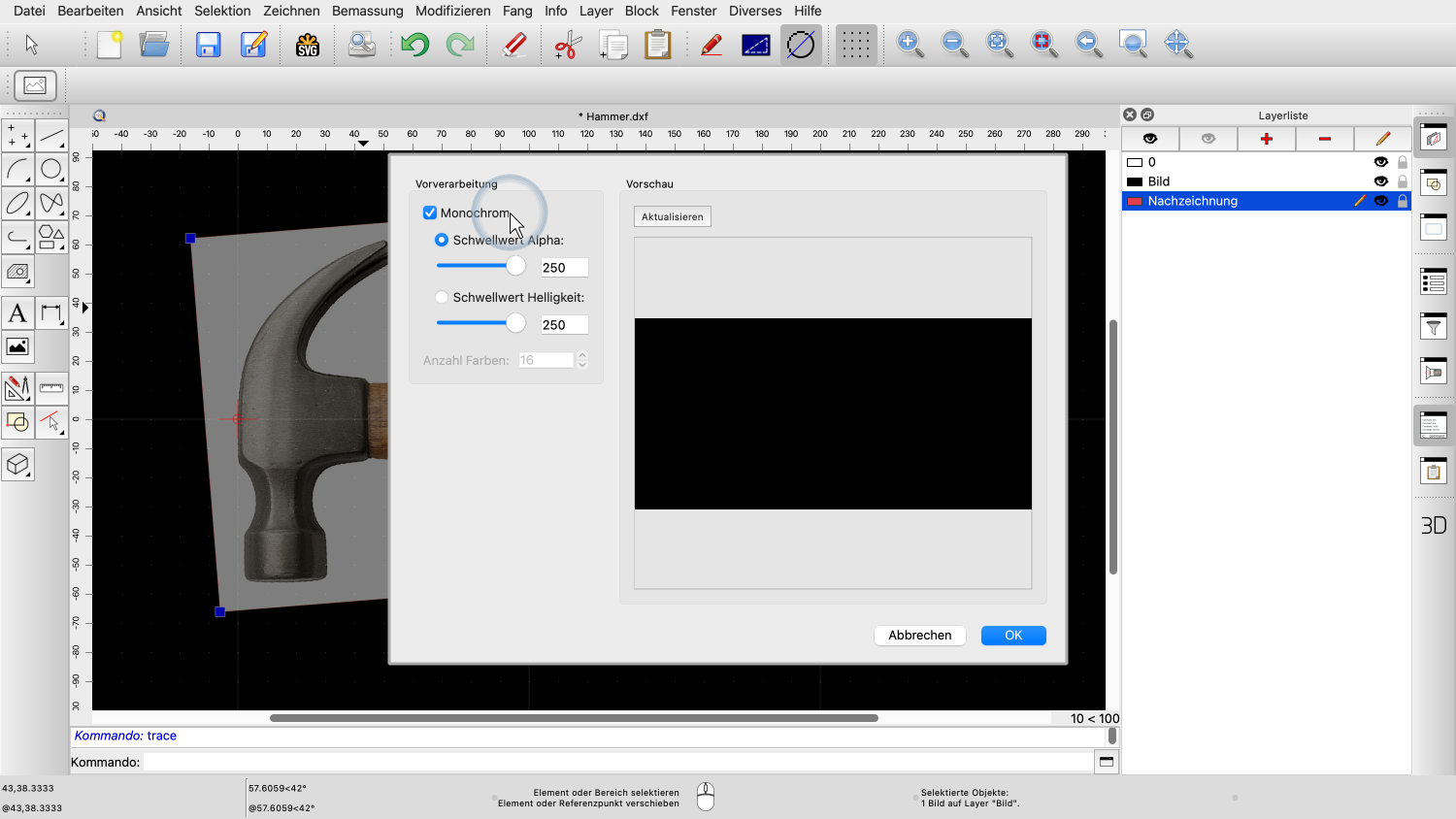 Dies zeigt den Nachzeichnungsdialog mit einer Vorschau unserer Bitmap.