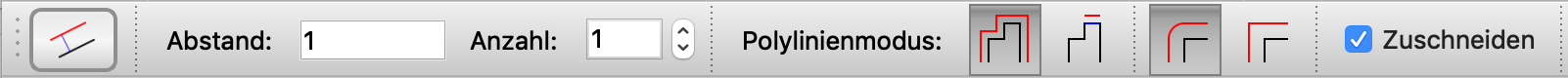 Modifizieren > Versatz (mit Abstand) - Die Optionenwerkzeugleiste des Versatzwerkzeugs wird oben mit dem zuletzt verwendeten Wert für den Abstand angezeigt (hier "1"):