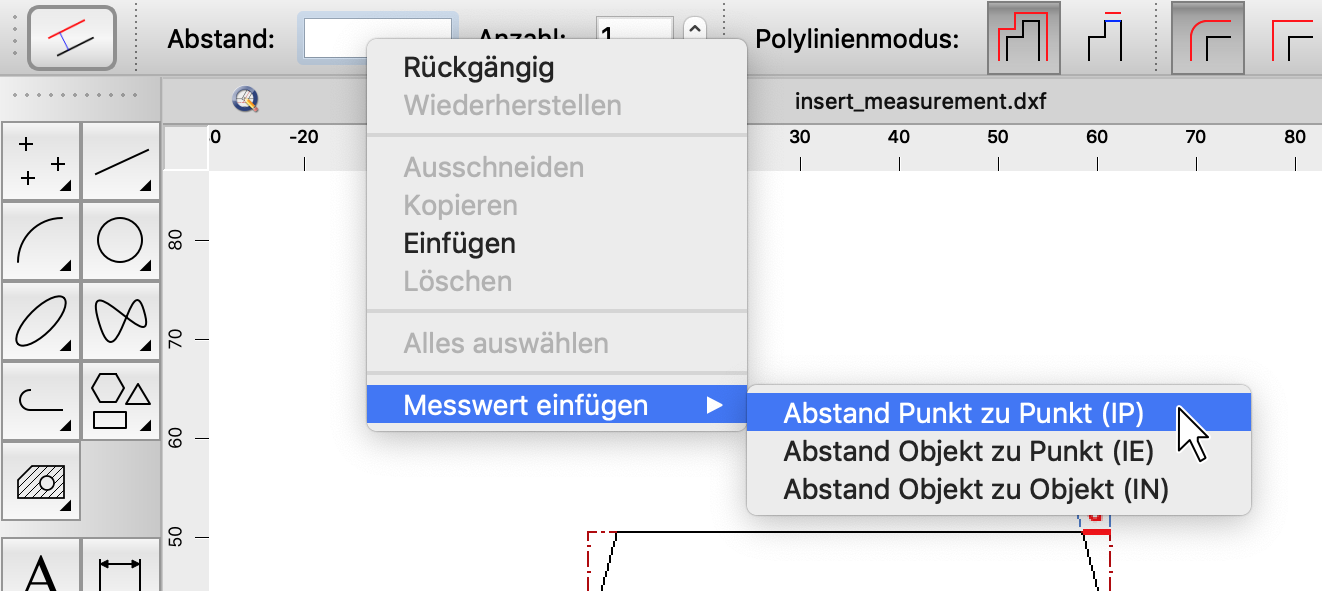 - Löschen Sie den Inhalt des Feldes Abstand und klicken Sie mit der rechten Maustaste in das Eingabefeld. Ein Kontextmenü wird angezeigt. Wählen Sie den Eintrag Messung einfügen und dann Abstand Punkt zu Punkt: