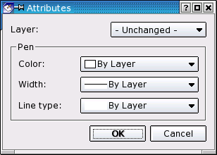 Při přechodu z QCadu 1 na QCad2 můžete zjistit, že si vlastnosti prvků ve starých výkresech již neodpovídají. Obvykle se doporučuje nastavit všechny vlastnosti na "Dle hladiny". Provedete to tak, že z menu Modifikace vyberete položku Vlastnosti skupiny prvků. Poté vyberete všechny prvky a kliknete na tlačítko pro pokračování. V dialogovém okně změňte všechny vlastnosti na "Dle hladiny" jak je vidět na obrázku 150.