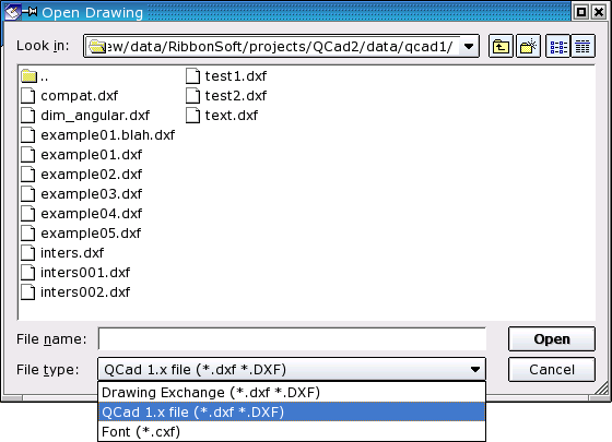 Při otevírání výkresů vytvořených v QCadu 1 můžete očekávat problémy s kótami, šrafy a textem. Je to způsobeno tím, že DXF formát tvořený QCadem 1 není na 100% kompatibilní se standardem. Můžete importovat DXF výkresy z QCadu 1 změnou formátu v dialogovém okně 'Otevřít výkres' na 'Soubor QCad 1.x (*.dxf *.DXF)' jak je vidět na obrázku 149.