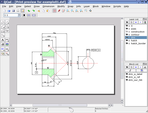 Um eine Zeichnung mit QCad auszudrucken müssen Sie zuerst einen Skalierfaktor festlegen. Das kann 1:1 oder ein beliebiger anderer Faktor sein. Aktivieren Sie immer die Druckvorschau bevor Sie einen Ausdruck machen. In der Druckvorschau können Sie den Skalierfaktor einstellen und die Zeichnung auf dem Papier positionieren.