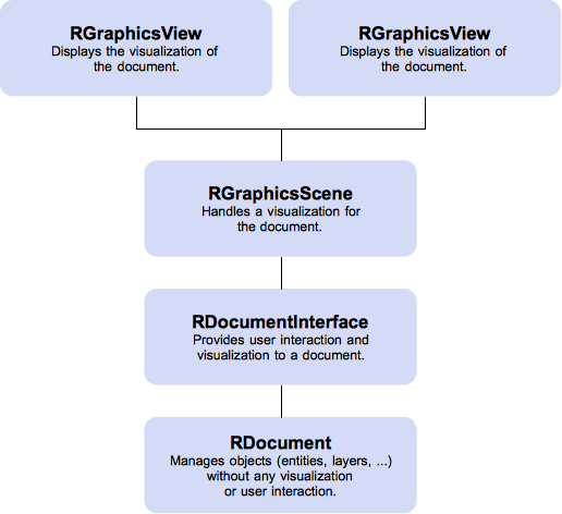 While the document knows what entities are and how they are geometrically defined, the graphics scene knows how each entity looks like and the graphics view knows how to display that visual representation of an entity to the user. The document interface connects a document to one or multiple graphics scenes and has some other important responsibilities that are outlined later on.