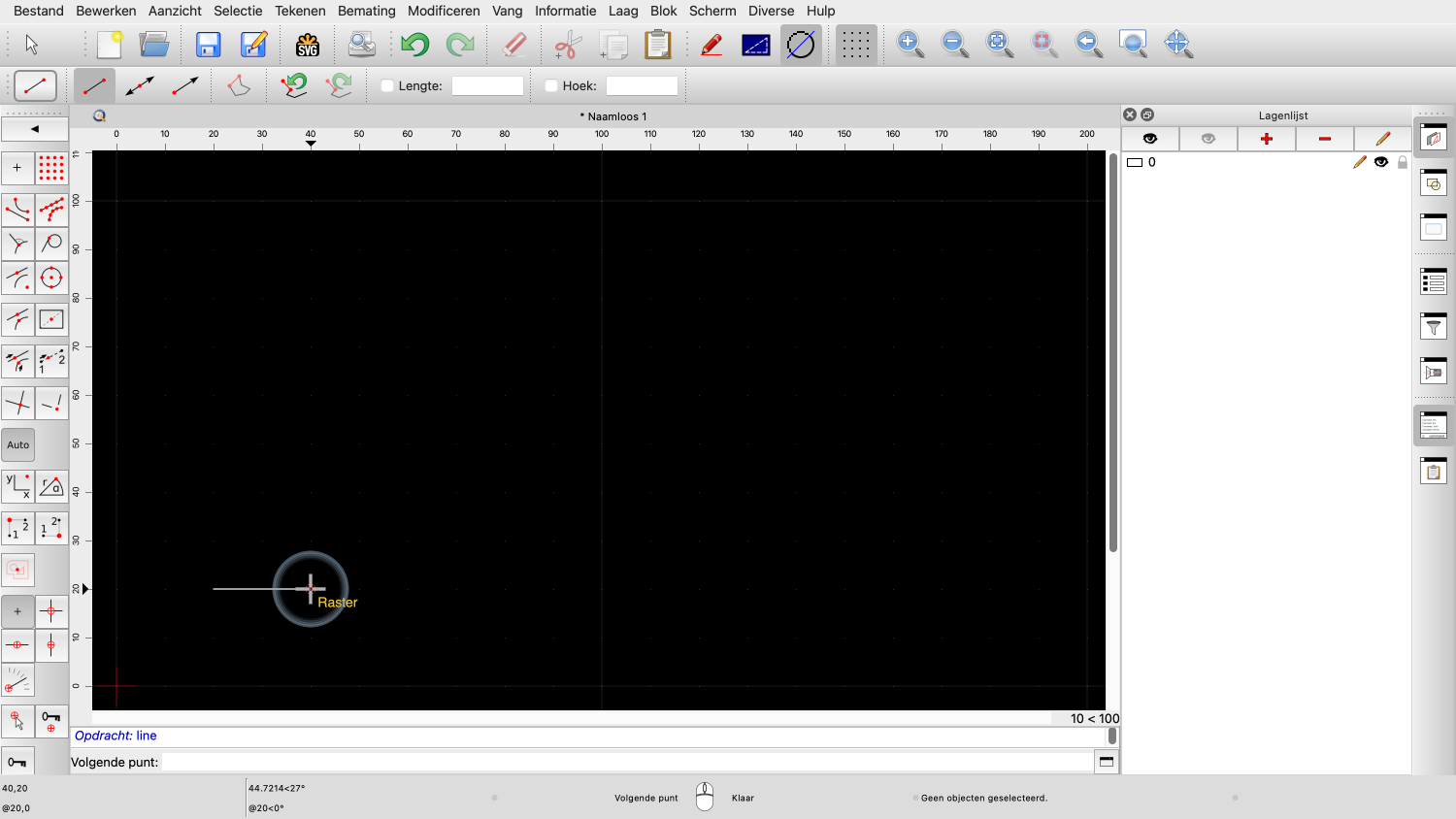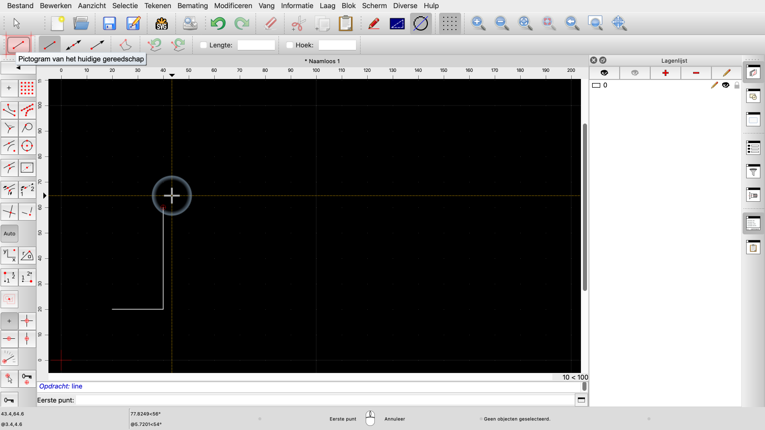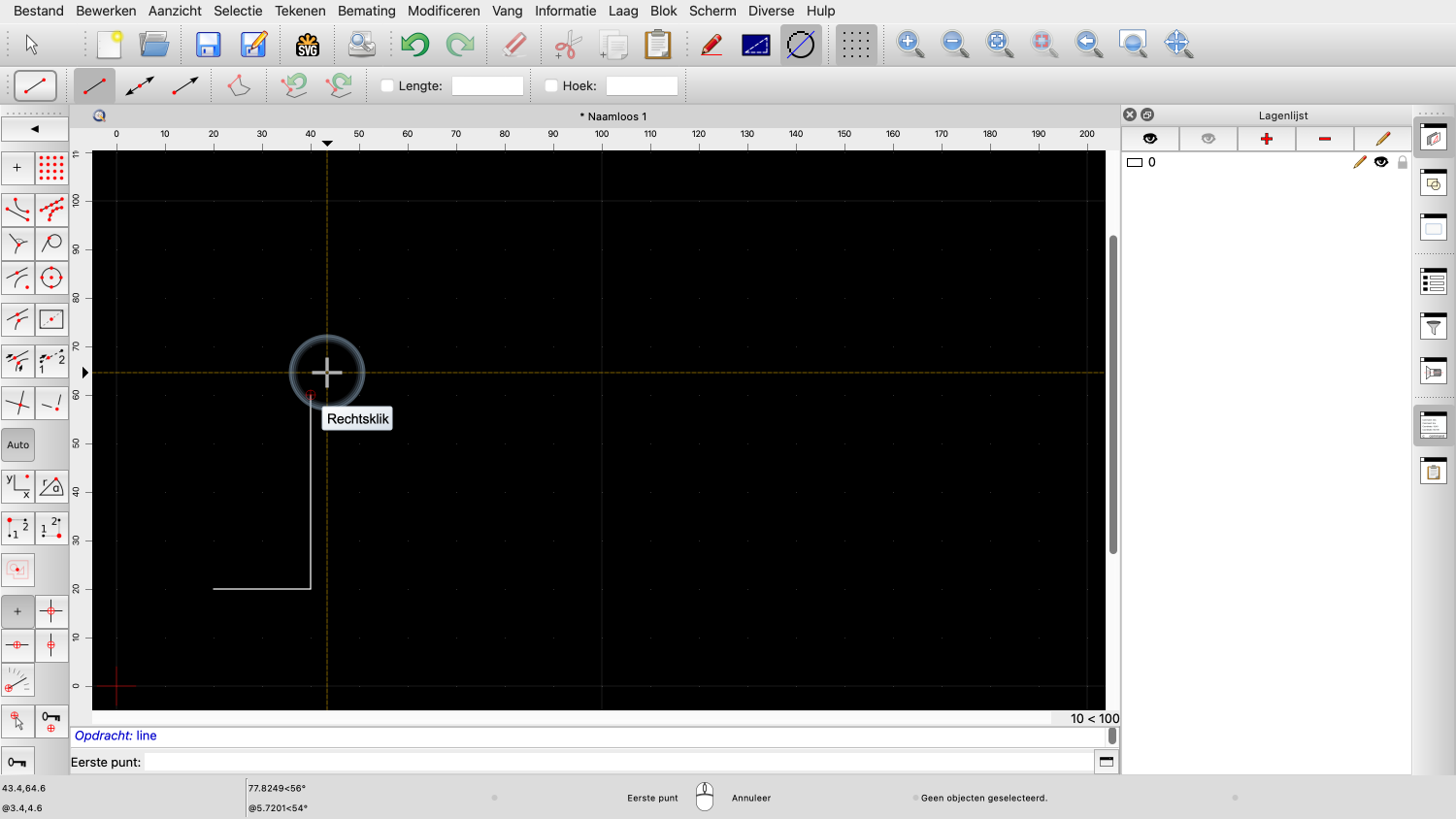De eerste klik in het tekengebied bepaalt het beginpunt van de eerste lijn.