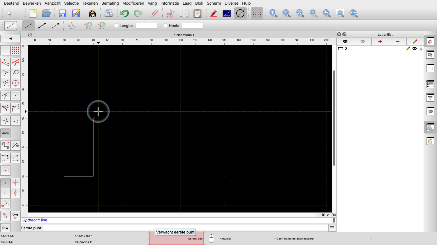In de statusbalk onderaan kunnen we ook zien dat QCAD het eerste punt van een nieuwe lijn verwacht.