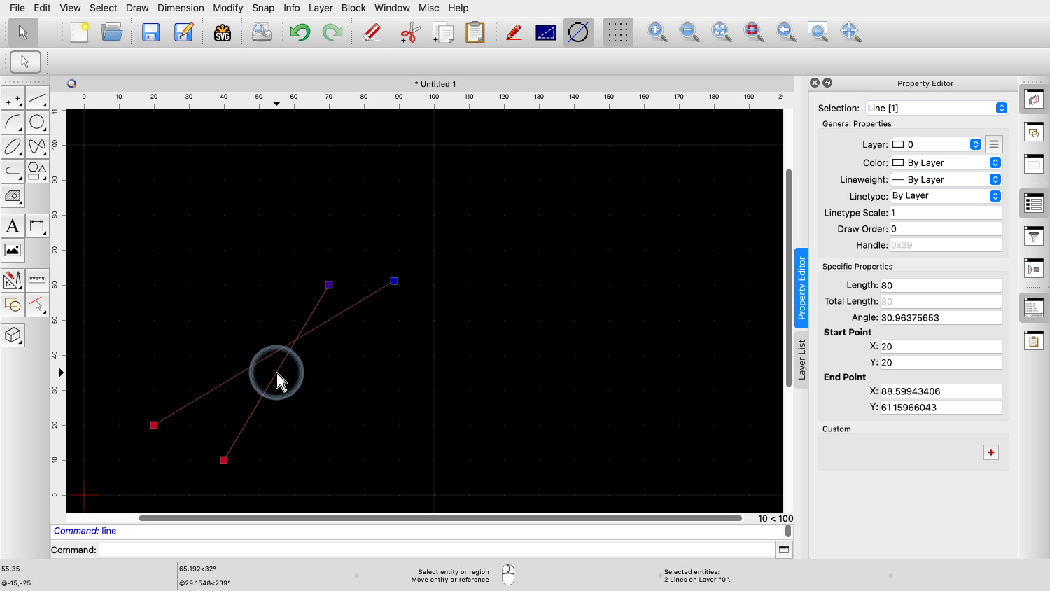You should now know how to use the property editor of QCAD to view and change properties of entities in your drawing.