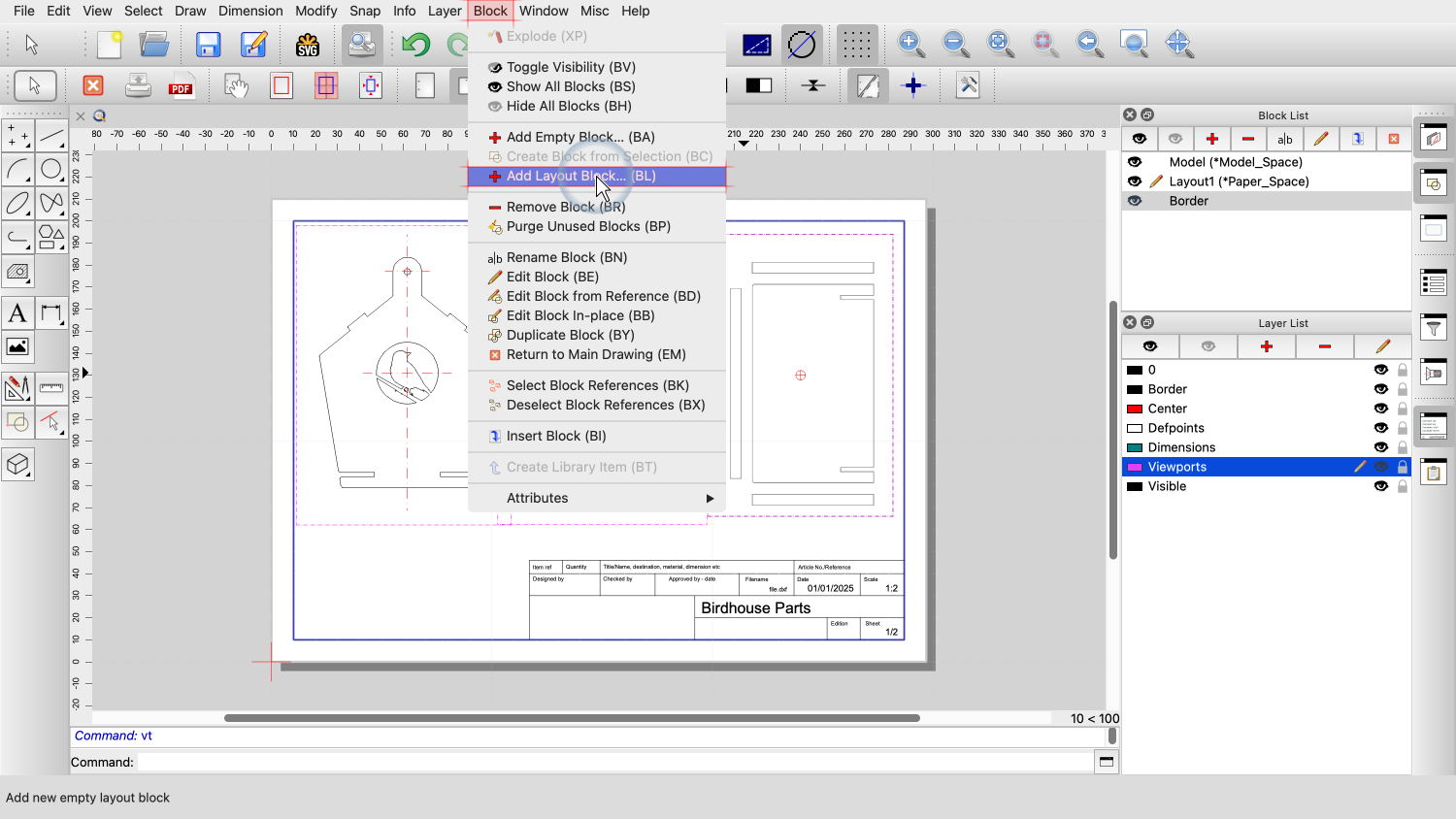 one of two pages. Let's add another layout to our drawing. We can add new, empty layout blocks using the