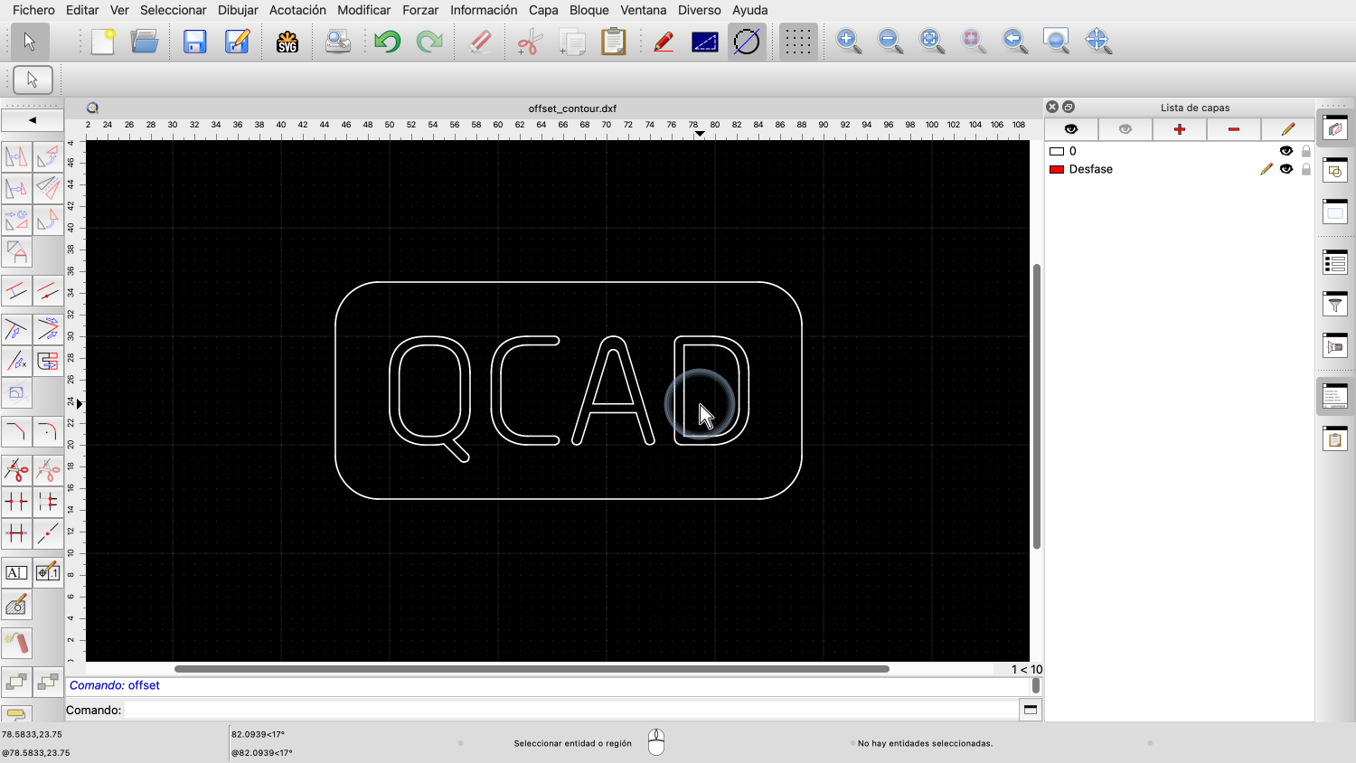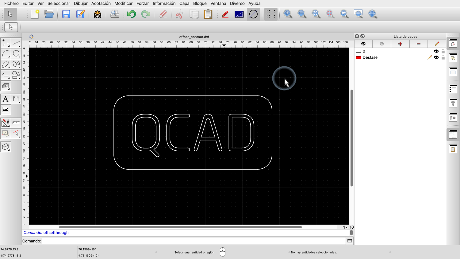 Si hacemos clic en una polilínea o en una cadena de entidades conectadas, QCAD desfasa automáticamente todo el contorno.