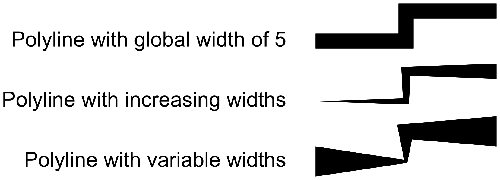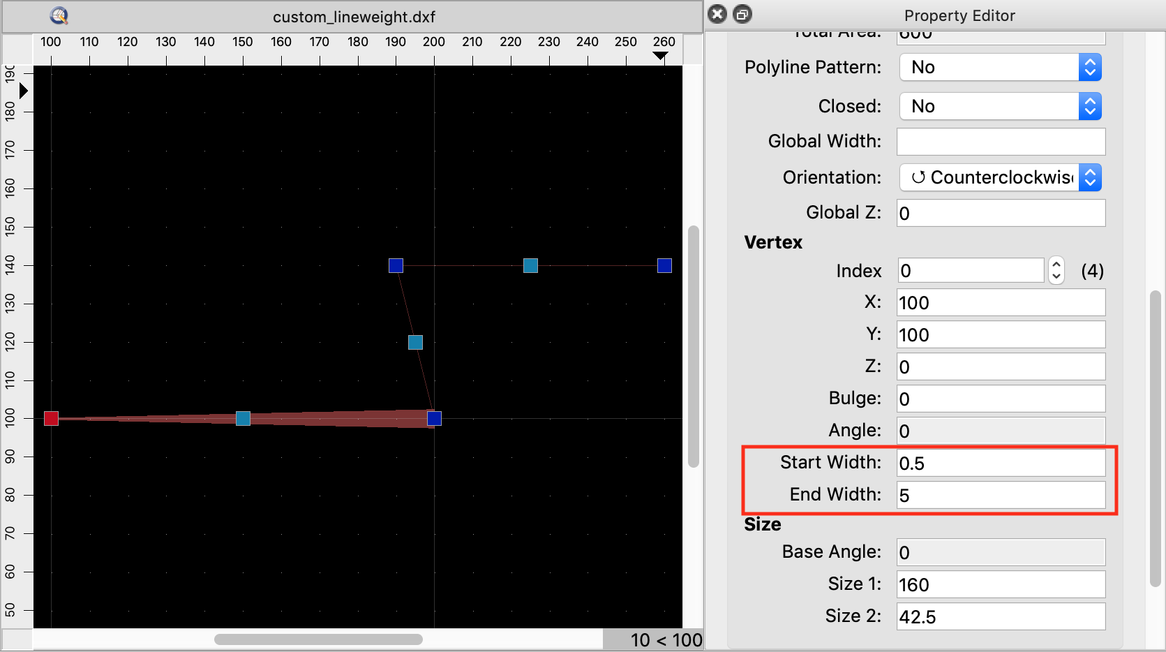 Alternativamente, puede asignar grosores de línea personalizados al inicio o al final de un segmento individual de la polilínea (propiedades anchura inicial y anchura final). En este ejemplo, la anchura inicial del primer segmento se ha fijado en 0,5 y la anchura final en 5: