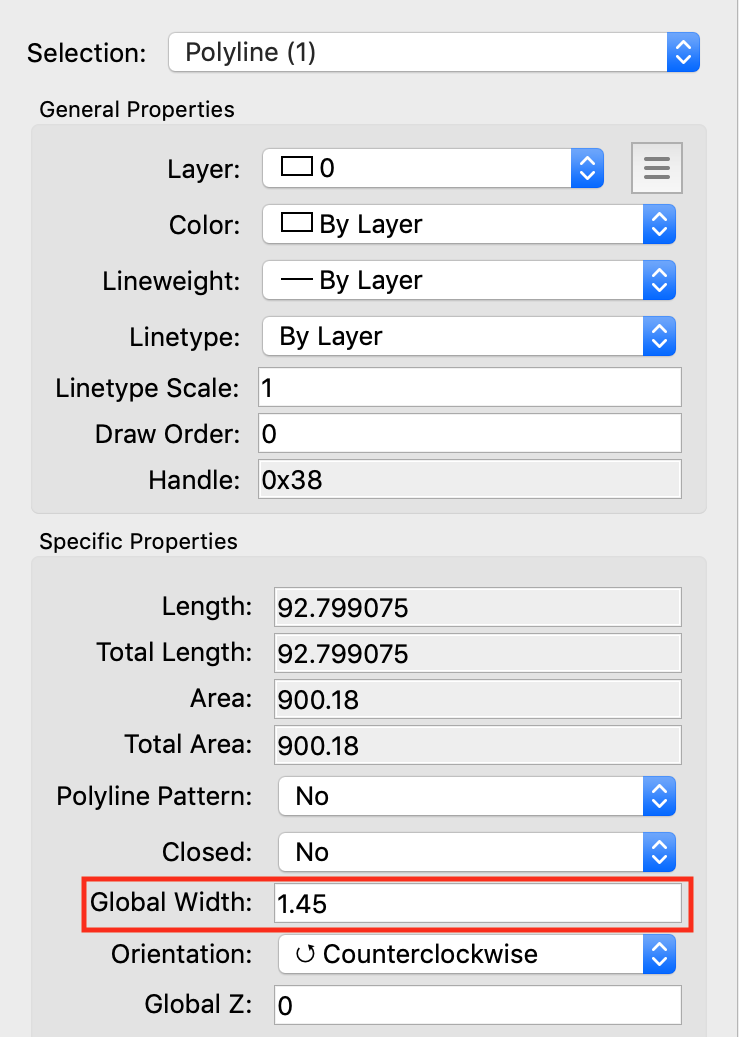 Puede seleccionar una o varias polilíneas y utilizar el editor de propiedades (Ver > Editor de propiedades) para asignar cualquier grosor de la línea(anchura global) personalizado: