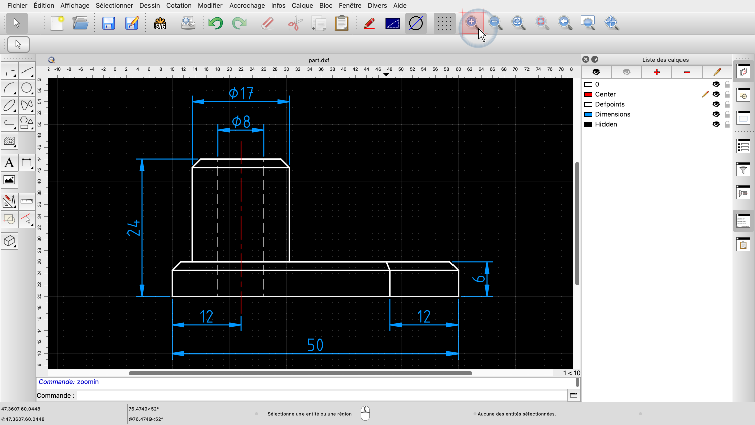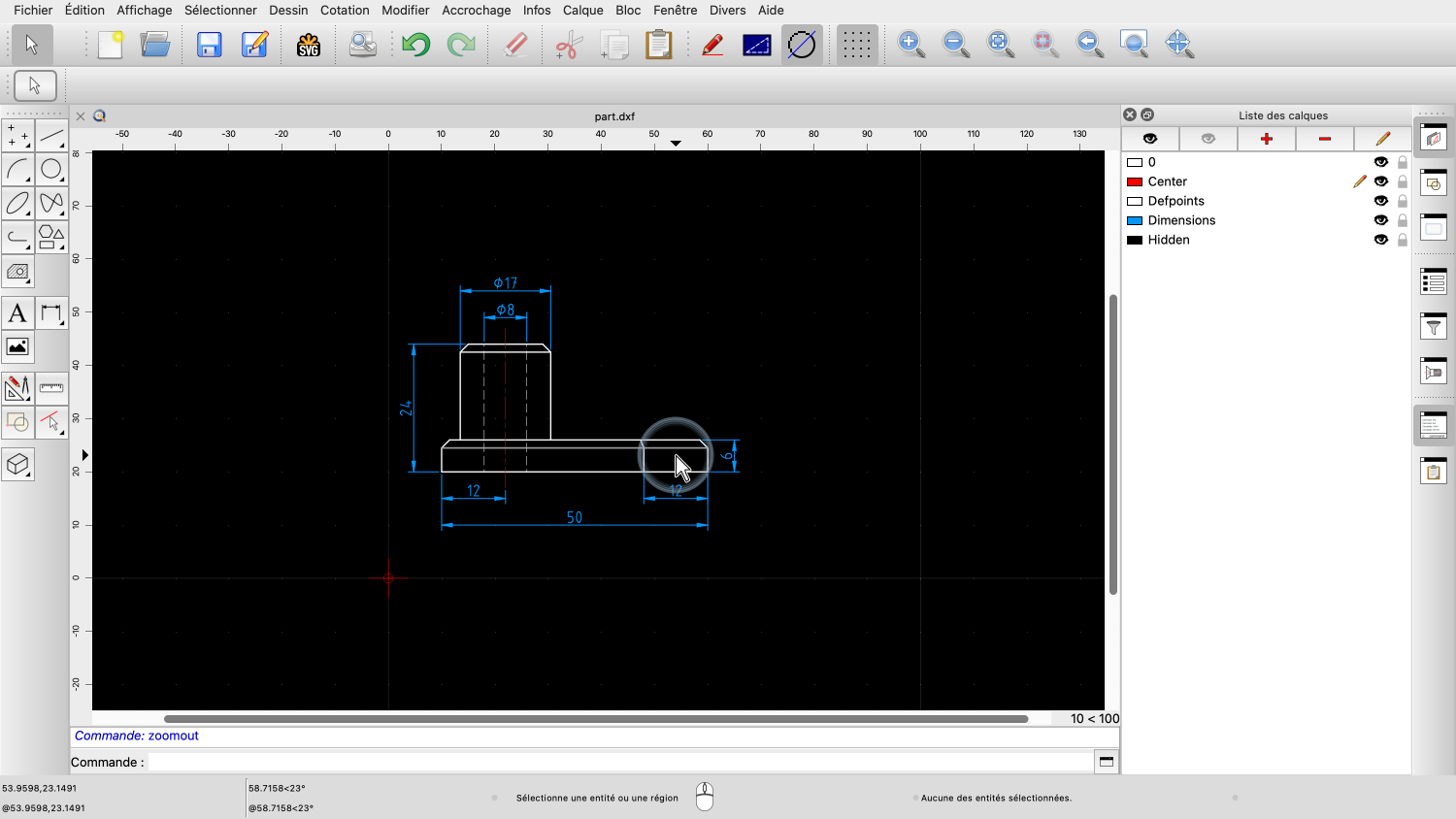 Dès que nous relâchons le bouton de la souris, QCAD zoome sur la zone choisie.