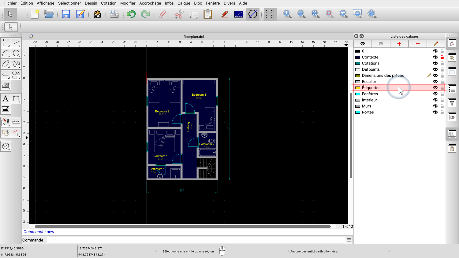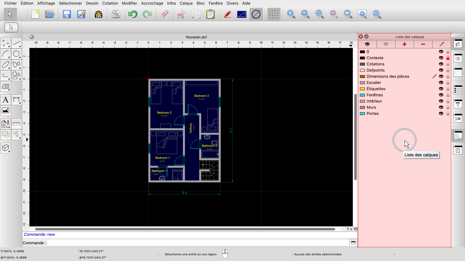 Par exemple, pour supprimer le calque contenant les dimensions des pièces, nous activons d'abord le calque en cliquant sur son nom.
