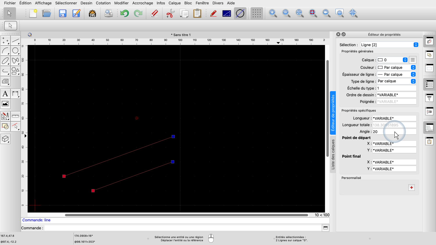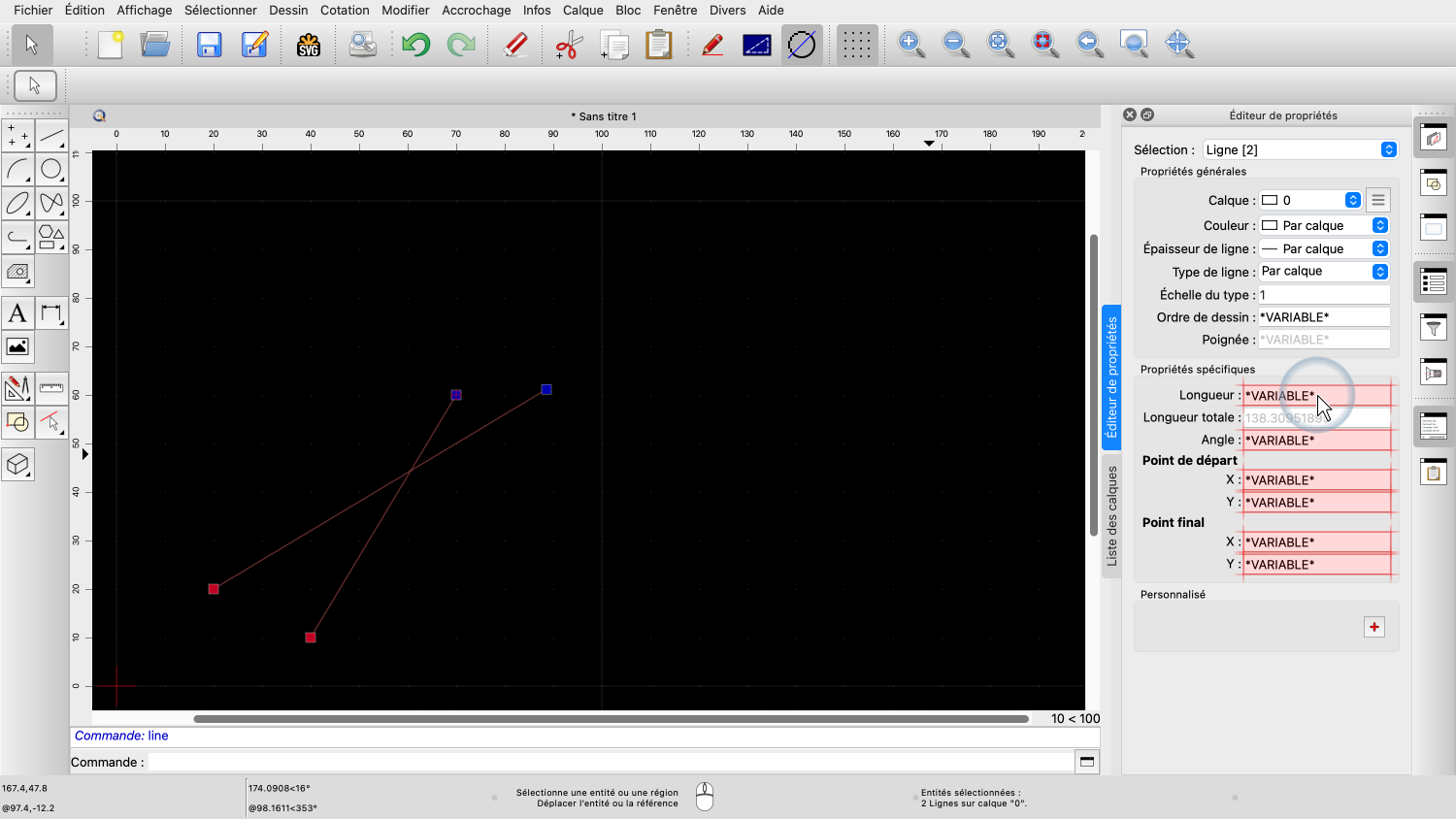 Les autres propriétés comprennent la longueur de la ligne ou son angle, ainsi que les coordonnées du point de départ et du point final.