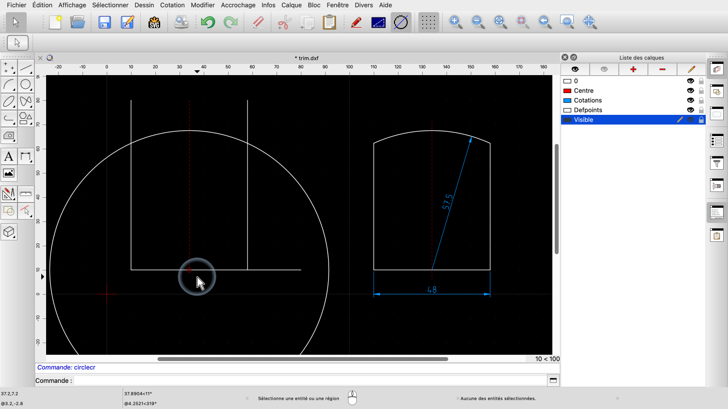 En faisant une sélection, nous indiquons à QCAD les entités avec lesquelles il doit travailler.