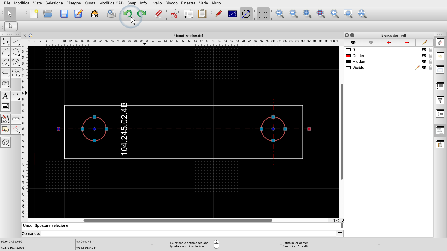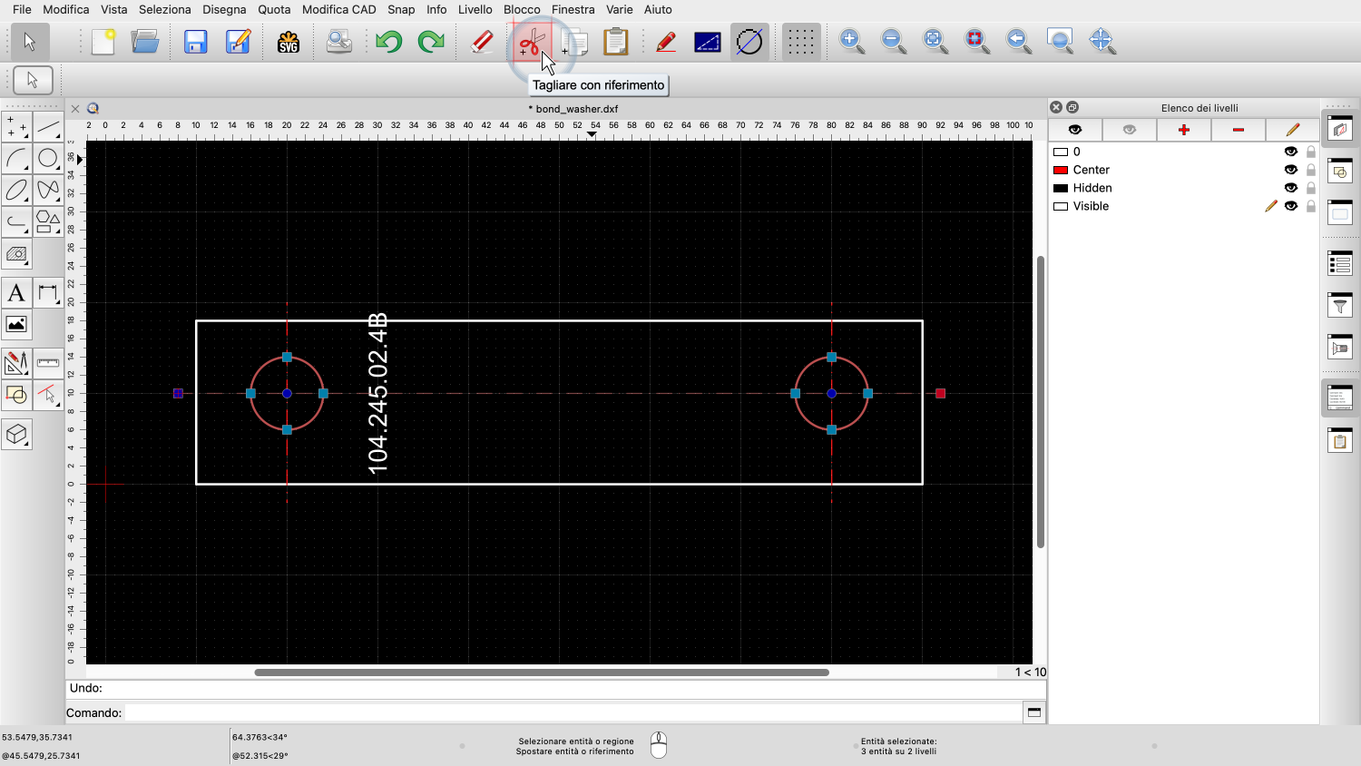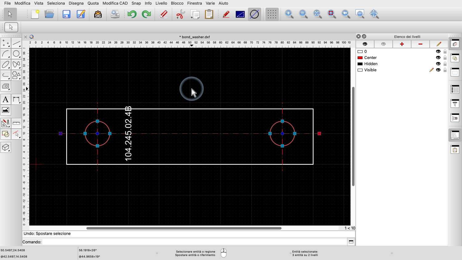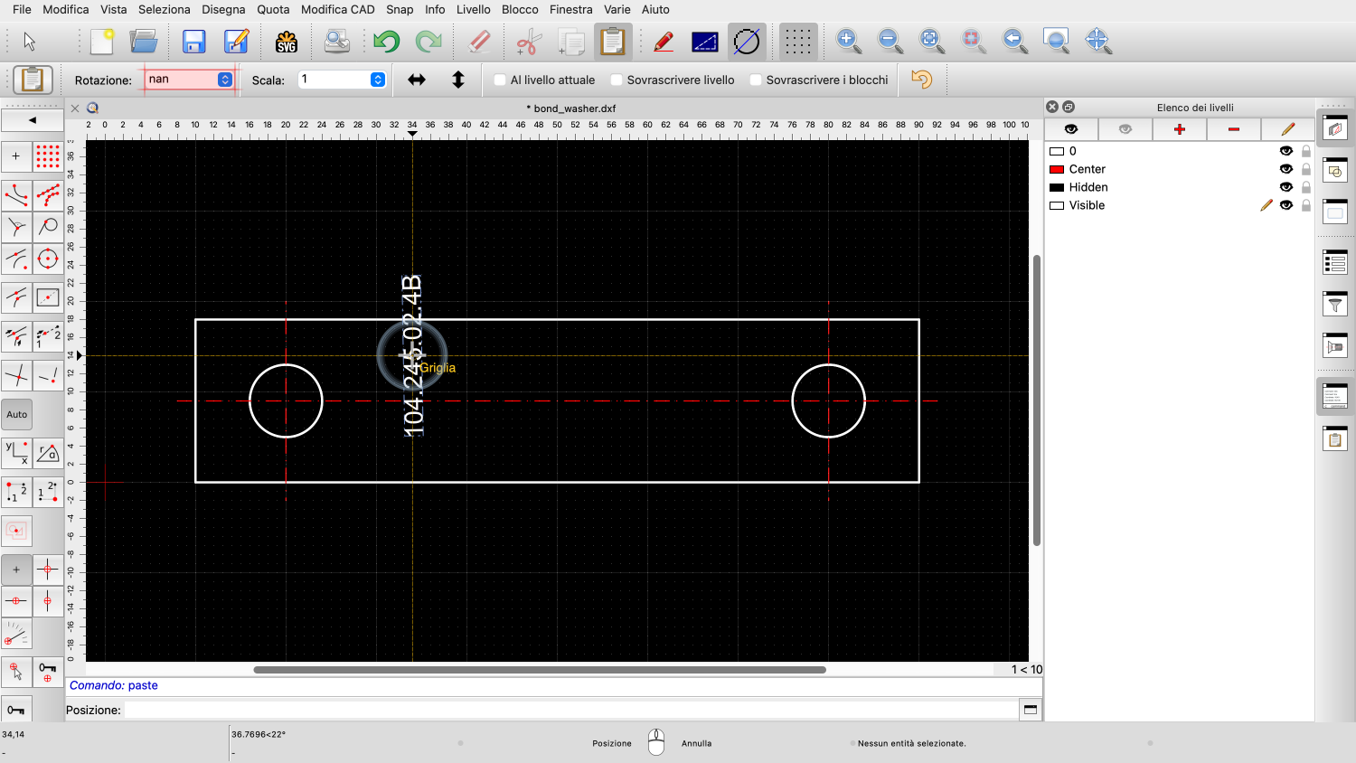 La linea centrale e i due cerchi sono ora negli appunti di QCAD.